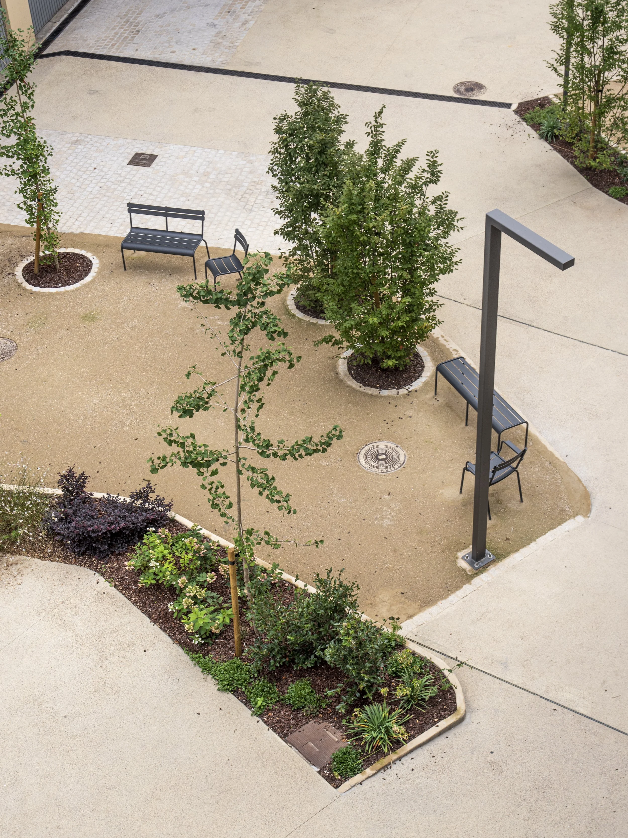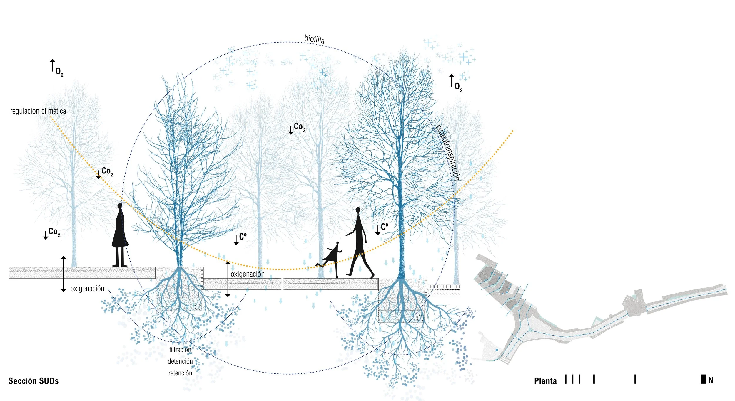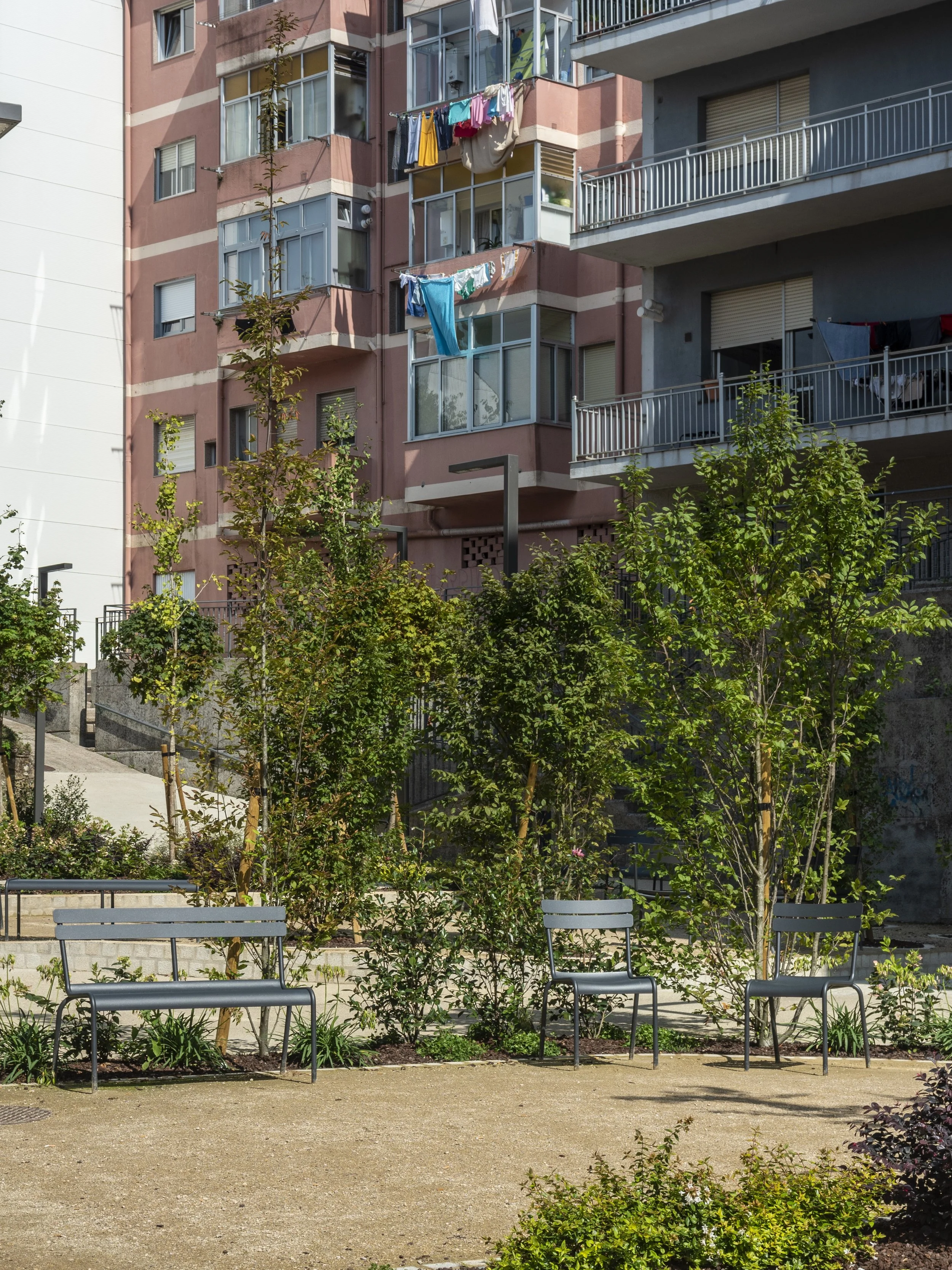 Una serie de jardineras que se concatenan a través de microtopografías que resuelven los pasos transversales, los accesos a viviendas y a garajes. Unas franjas vegetadas que mitigan el efecto de isla de calor creando un patio público, un jardín de interior de manzana con arbustos, árboles y trepadoras.