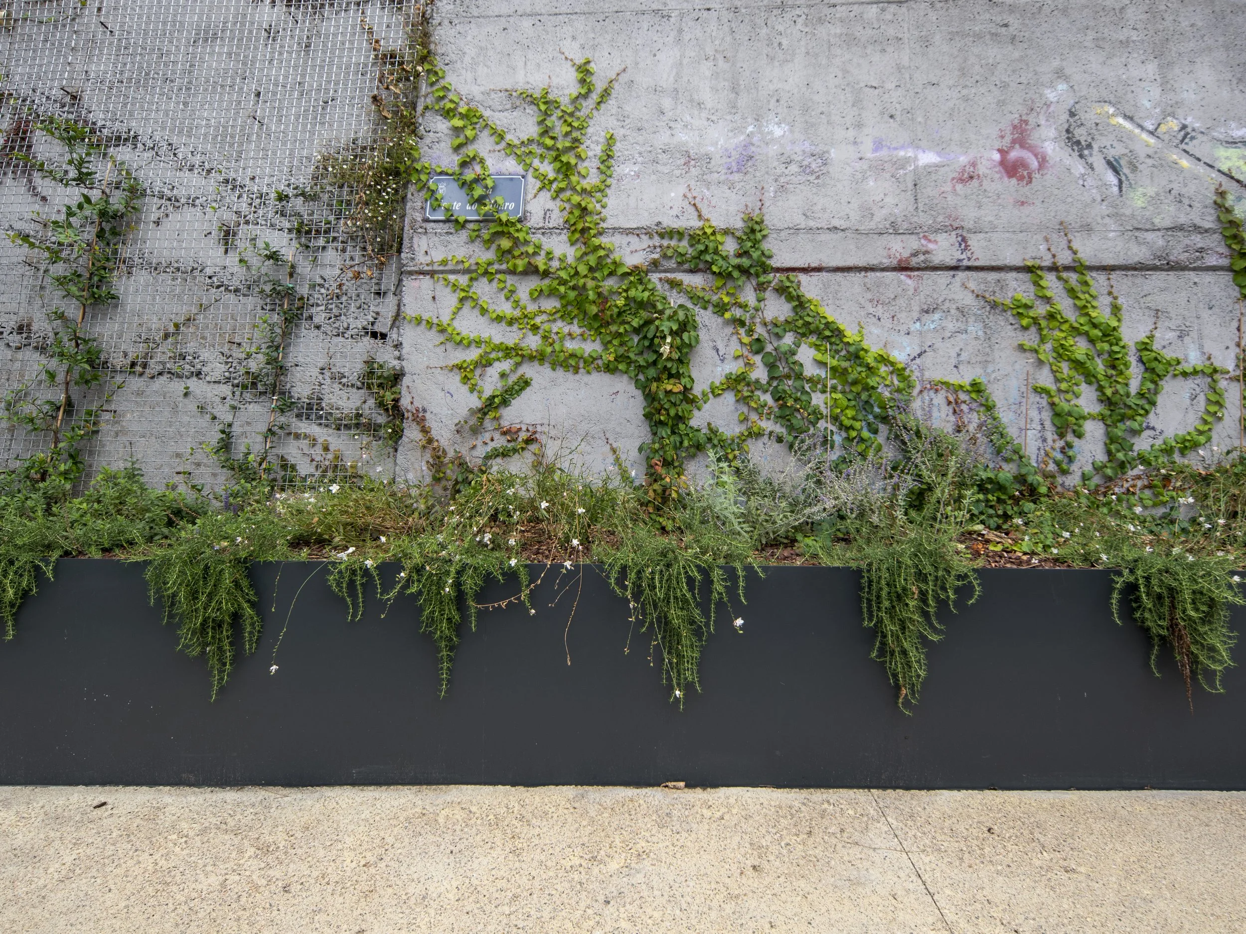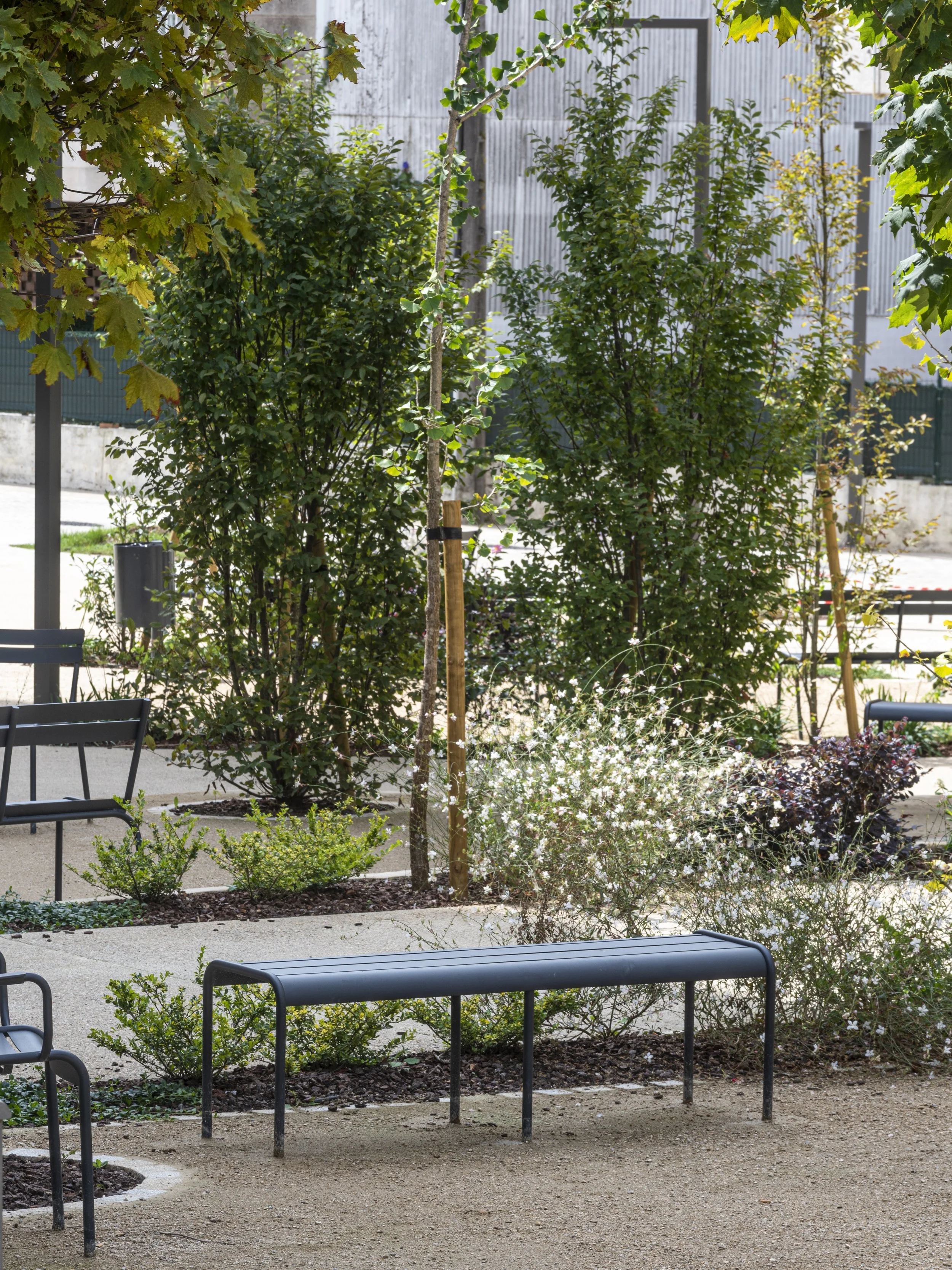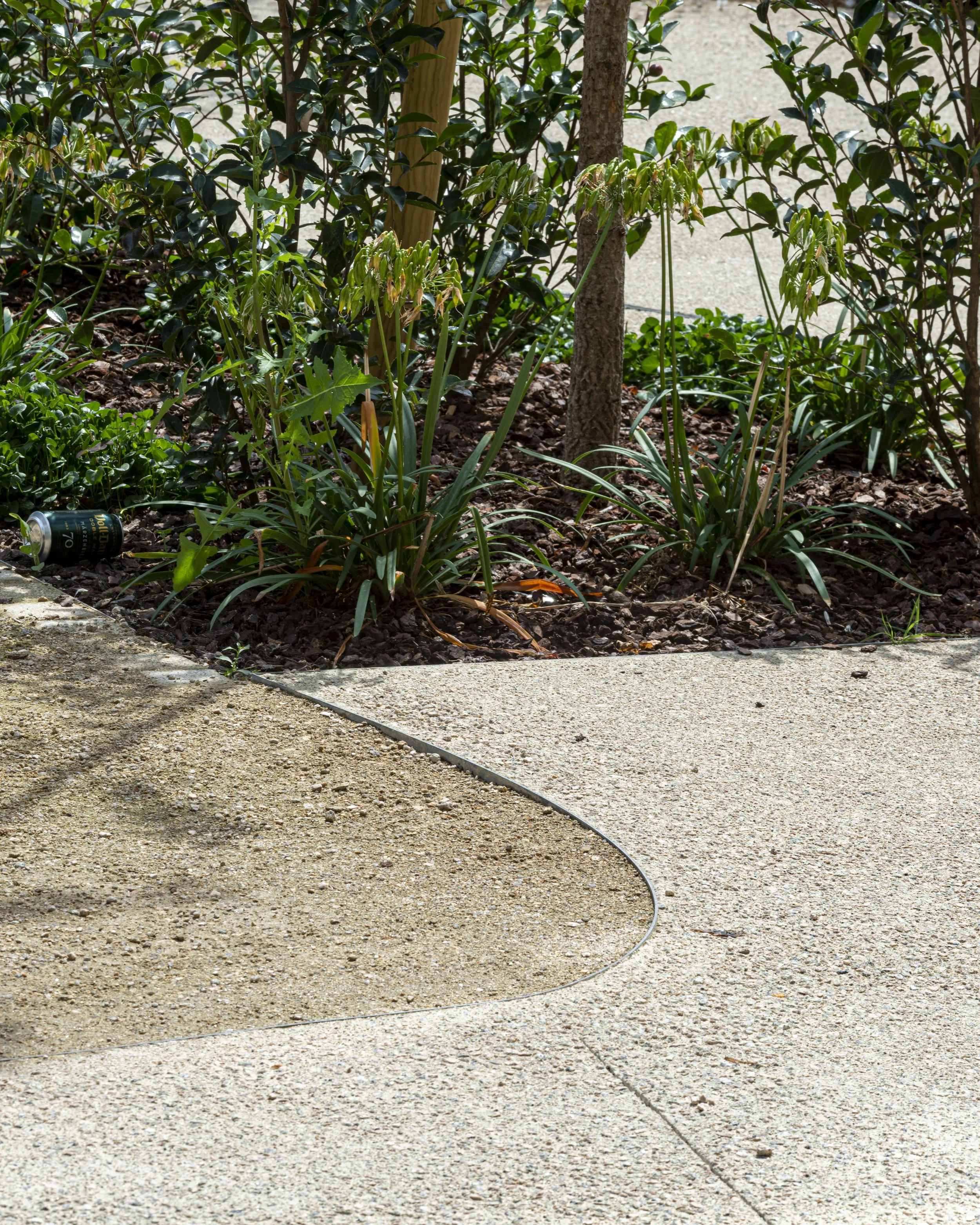 Una serie de jardineras que se concatenan a través de microtopografías que resuelven los pasos transversales, los accesos a viviendas y a garajes. Unas franjas vegetadas que mitigan el efecto de isla de calor creando un patio público, un jardín de interior de manzana con arbustos, árboles y trepadoras.