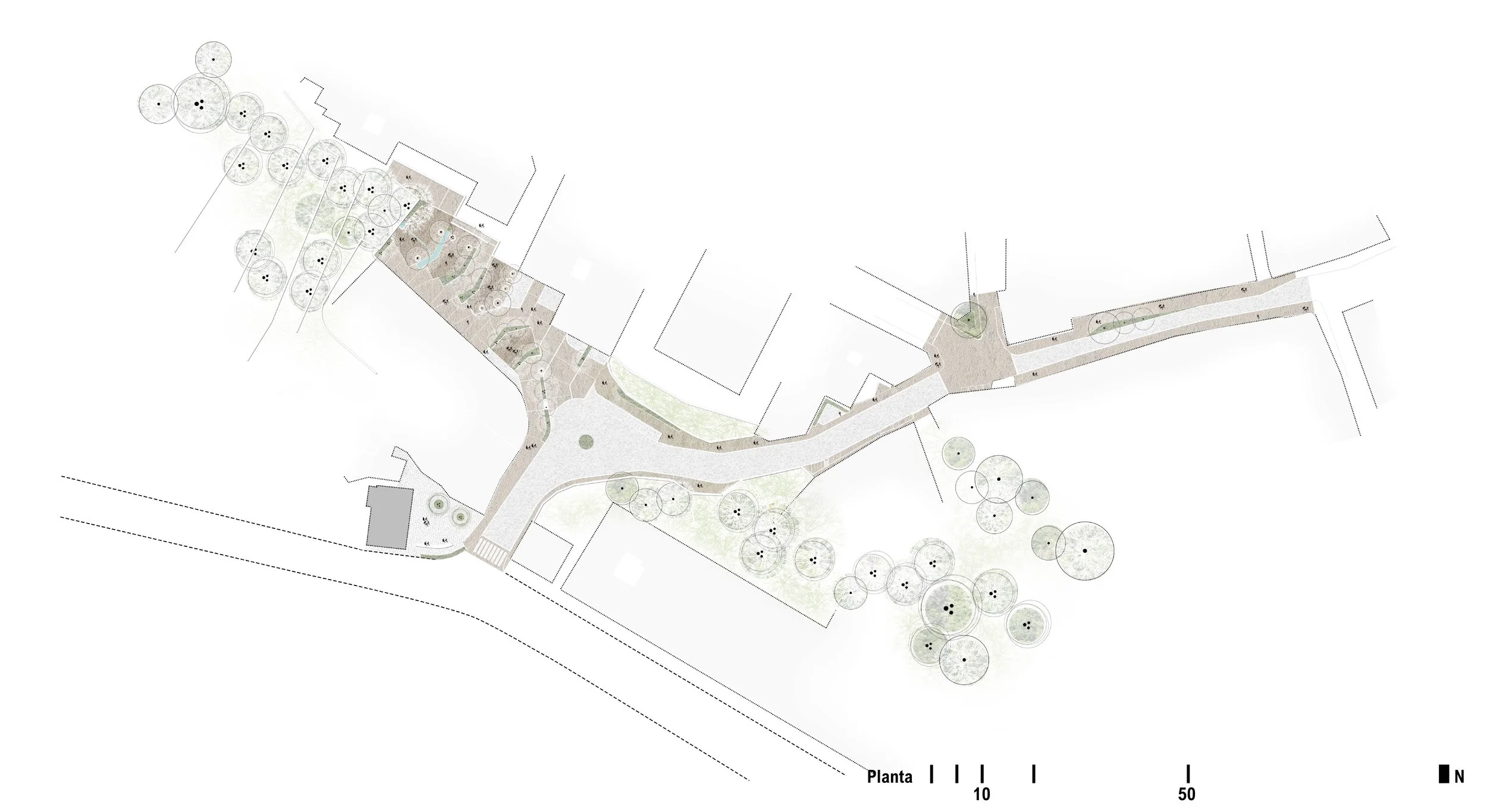 El encargo solicita la mejora de los espacios públicos en materia de accesibilidad y, el proyecto, trata de mejorar la accesibilidad mediante una plataforma única y recuperar espacios comunes que habian sido consquistados por el asfalto a través de un nuevo velo de pavimentos, plataformas y jardineras que mitigan, además, las inundaciones durante las lluvias torrenciales.